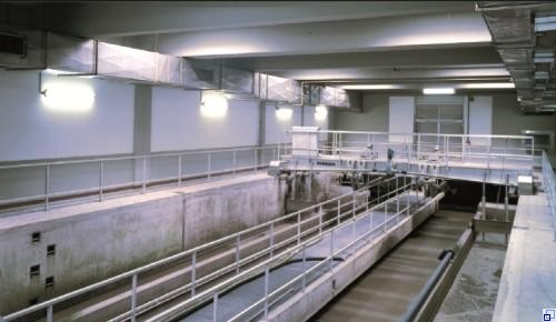 Um Geruchsbelästigungen vorzubeugen, sind diese Anlagenteile in einem geschlossenen Bauwerk mit Abluftbehandlung untergebracht. Die Abluftreinigung erfolgt in einem zweistufigen Kreuzstromwäscher.